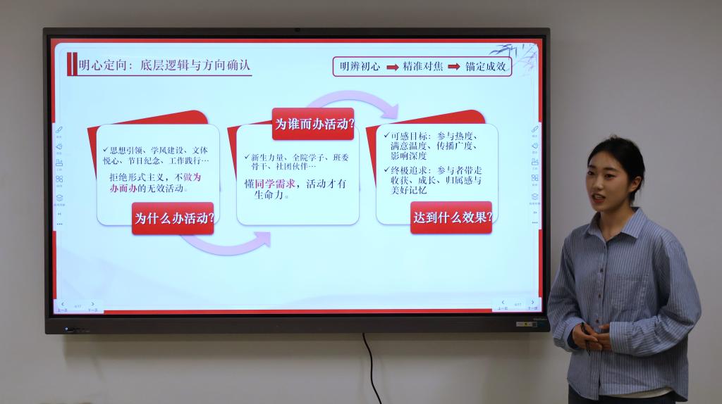 活动伊始,衡延笃老师以长征精神为核心开展主题思想教育。他用鲜活的历史故事、深入浅出的理论讲解,带领学员重温长征岁月,深刻阐释长征精神的时代内涵与青年使命,引导大家传承红色基因、厚植家国情怀,坚定听党话、跟党走的理想信念,在青春赛道上传承红色力量、勇担时代重任。 校学生会创新发展部部长卢佳宁带来活动策划专项培训。她结合校学生会一线工作实践,从活动主题设计、流程排布、组织落地、细节把控等方面进行系统全面讲解,为学员开展团学工作、统筹校园活动提供清晰实操思路,有效提升大家活动组织、全局统筹与规划执行能力。