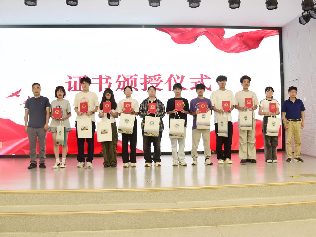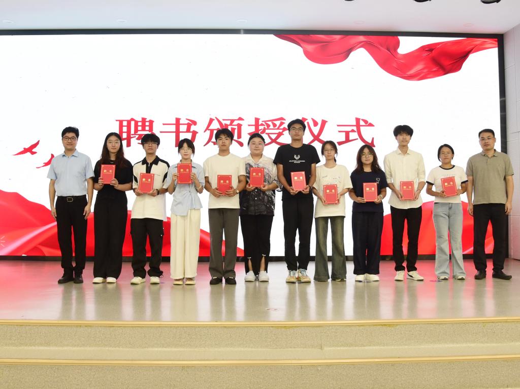 会议随后举行颁授仪式:校关工委秘书长张才兴与宣传部副部长梁建为上一届20位学生委员颁发荣誉证书及纪念品;校团委书记汪超与学工部副部长俞立峰为新一届20位学生委员颁发聘书。